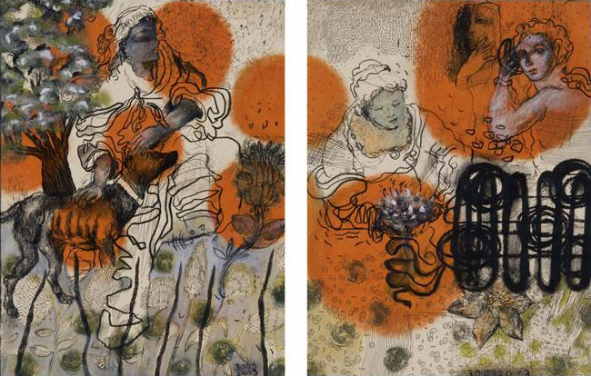 Artemis, Diptychon, je 40 x 30 x 7, Mischtechnik auf Karton / Holz, 2013