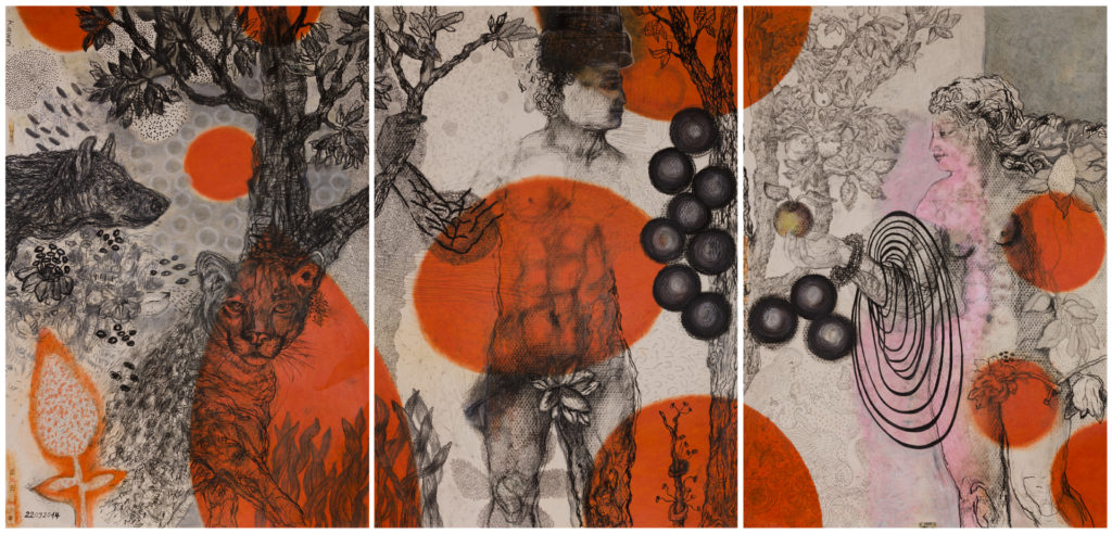 Paradise (nach A. Dürer), Triptychon, 100 x 210, Mischtechnik, 2014