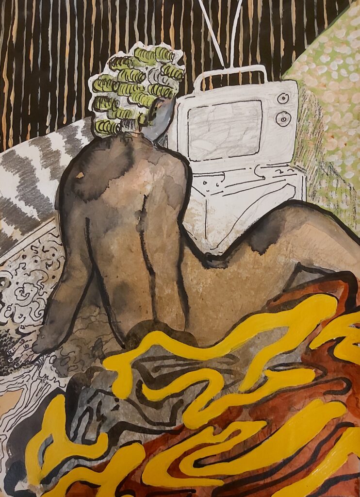 "Symbiose mit TV", Mischtechnik auf Papier, 21 x 29,5, 2022/23
